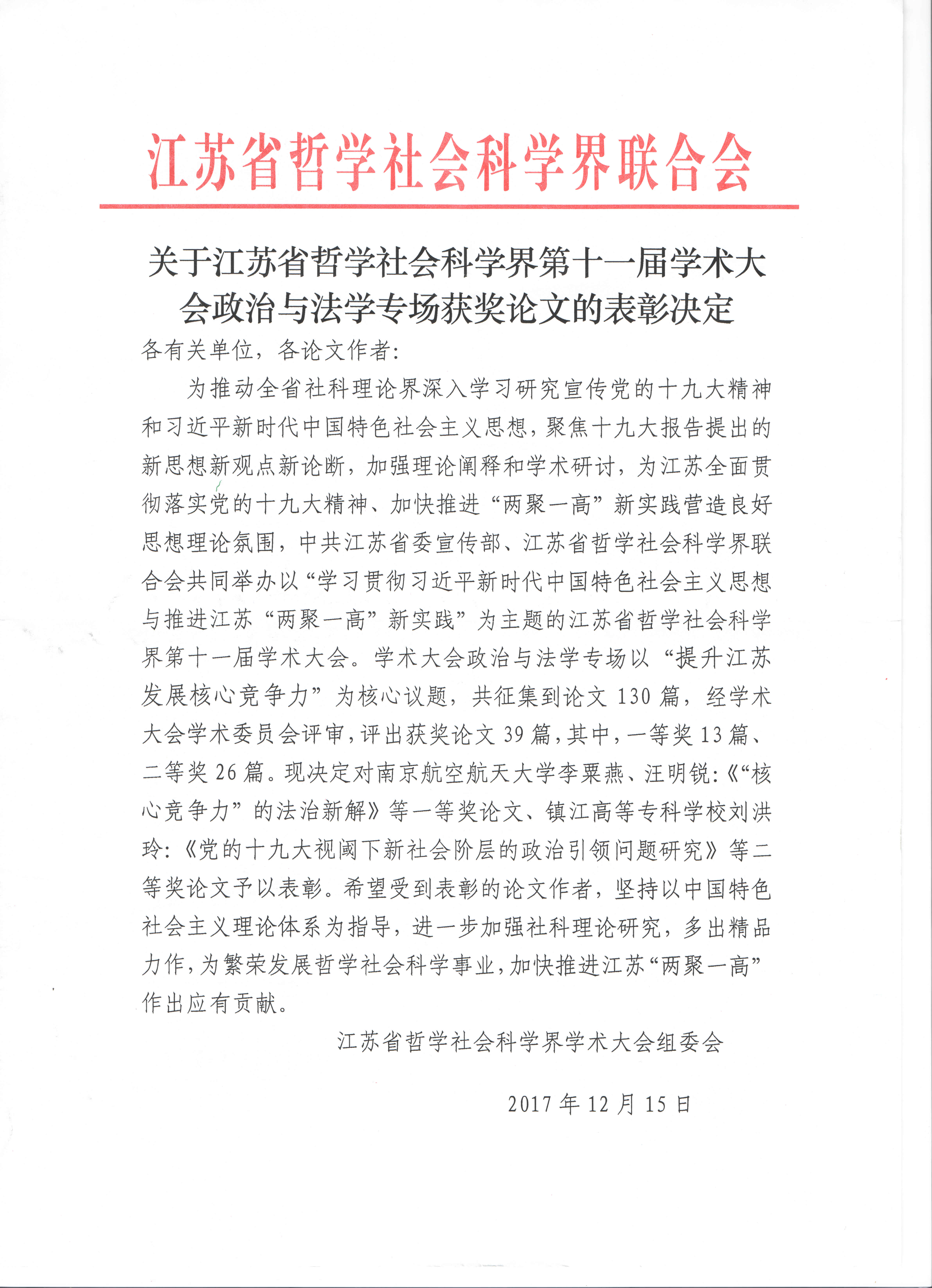 此次学术大会将促进全省哲学社会科学界在习近平新时代中国特色社会主义思想的指引下,为建设中国特色社会主义民主法治和提升江苏发展核心竞争力作出应有的学术贡献,而我校师生的获奖为提升av中文 在人文社科学科尤其是法学学科领域的影响力和美誉度,起到了良好的促进作用。