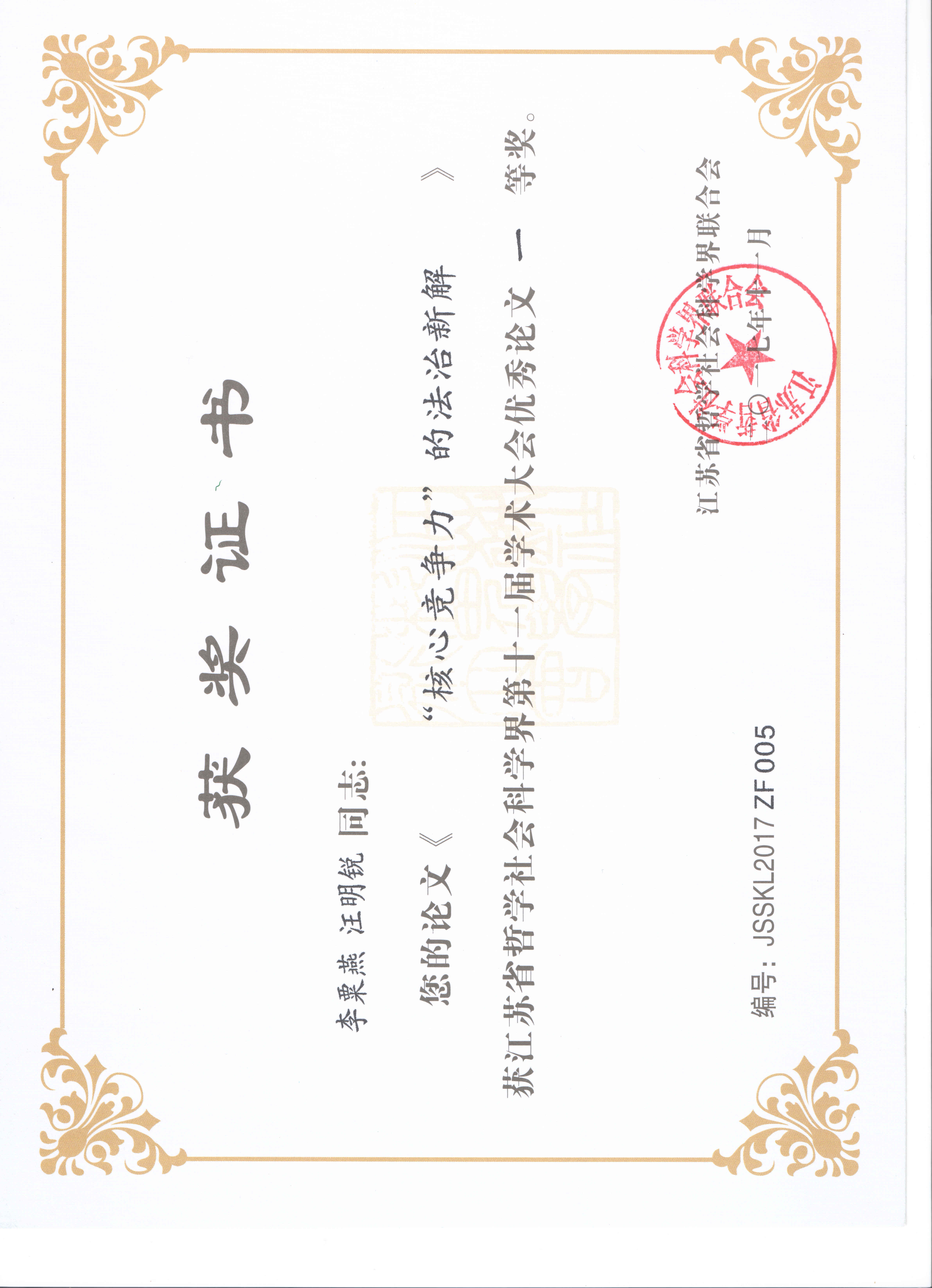 江苏省哲学社会科学界第十一届学术大会政治与法学专场的主题是“提升江苏发展核心竞争力”,来自省内外高校、党校、科研机构和法律实务界的代表100多人参加了政治与法学专场的会议,围绕这一主题展开热烈研讨。本次会议共征集论文130余篇,经学术委员会评审,评出获奖论文39篇,av中文 李栗燕教授与其研究生汪明锐同学合作的论文《“核心竞争力”的法治新解》荣获江苏省哲学社会科学界第十一届学术大会优秀论文一等奖,李栗燕教授应邀参加会议并在法学专场作了大会发言。