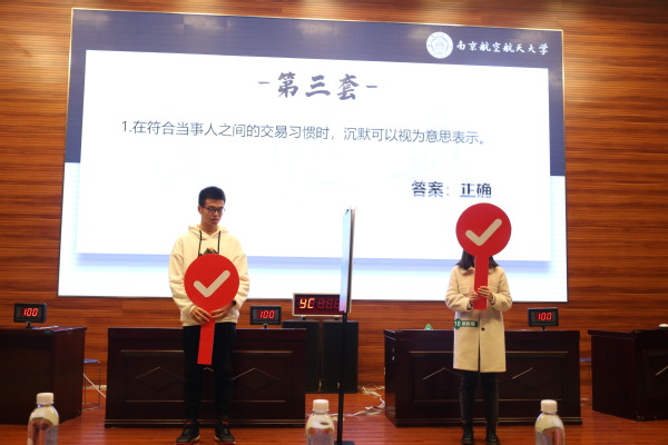 全场选手精彩对决,在法条与逻辑的碰撞中,为观众们带来一场民法知识盛宴。本次民法典知识竞赛以“治国有民,护航有法”为主题,旨在用知法于心,践法于行,辐射学生千余名,反响热烈,助力培育我校学子的“人文情怀”与“法律精神”。