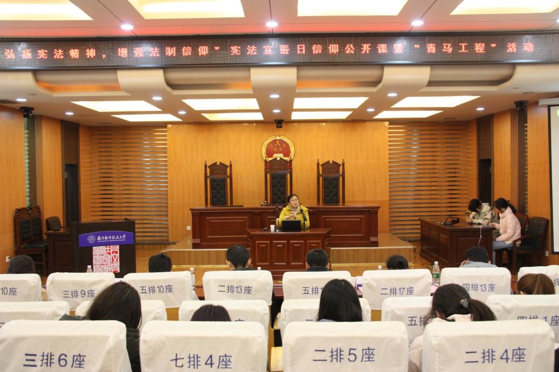 随后,法律系党支部李成玲老师上台,为同学们带来宪法知识普及专题讲座。李成玲老师以“我国宪法的发展与实施”为主题,分为“国家宪法发展历程”,“我国宪法的实施”,“宪法序言的发展变化”三大部分展开讲座。李成玲老师以提出“我国目前共有过几部宪法?” “宪法主要规定哪些内容?”等问题的形式带领青马班学员们层层剖析,细致入微地学习,了解了宪法的基本知识。在讲到宪法的实施时,李成玲老师强调:法律实施是宪法实施的重要环节。正如习近平总书记所言:“宪法的生命在于实施,宪法的权威也在于实施。”讲座最后,李老师寄语青马班学员们:作为普通公民,更作为新时代的新青年,希望大家弘扬宪法精神,强化宪法宣传教育实效,从而提高宪法意识,成为宪法的忠实崇尚者,自觉遵守者,坚定捍卫者。努力做到尊崇宪法,学习宪法,遵守宪法,维护宪法,运用宪法。
