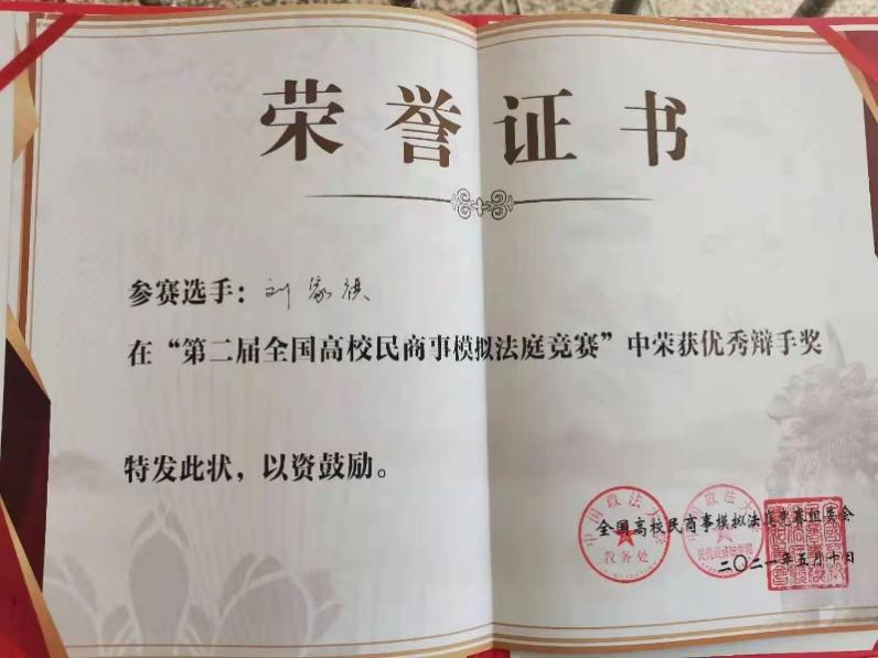 2021年5月7日——11日,av中文 组成代表队赴北京参加第二届全国高校民商事模拟法庭竞赛。学院法律系郭莉老师担任指导教师,关佳宝、刘家祺、刘季龙、刘炎昊、许海雯、刘婕等同学参加了比赛。刘家祺同学在比赛中脱颖而出,获得“优秀辩手”称号。