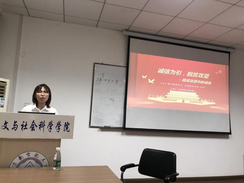 凌文慧同学讲述了在脱贫攻坚工作中 “诚信”的效益。正是因为做到了“脱贫攻坚,诚信先行”,我们如期完成了新时代脱贫攻坚的目标任务。脱贫攻坚生动诠释了共产党人的初心使命,也凝聚成了诚信、坚守、奉献的时代精神。