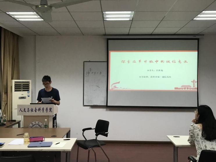 随后,吕世龙同学分享了“诚信”在改革开放时期中的意义。大国崛起,诚信先行。在改革开放40多年的探索实践中,“诚信”让广大企业赢得了市场,让中国制造走向了世界,让诸多变革举措成为了惠及14亿人民的改革红利。如今建立健全的社会信用体系已经成为我国不断深化改革开放、实现社会经济发展的保障。