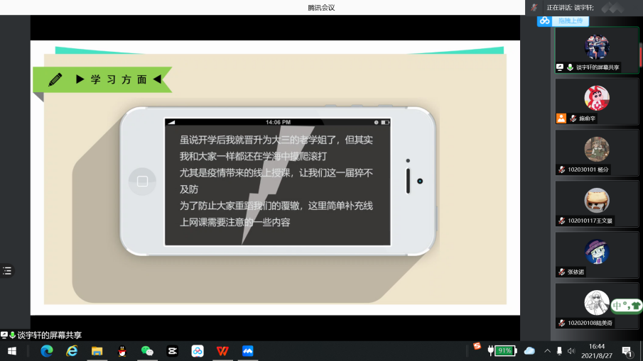 8月27日,av中文 2020级本科生线上召开了新学期年级大会,辅导员施俞辛针对准大二学生正处在度过“适应期”和远离“毕业季”的中间阶段,在思想上容易自我放松的情况,从假期回顾、学期计划、未来展望等三个方面带领学生以全新的面貌迎接大学新学年、人生新阶段的到来。