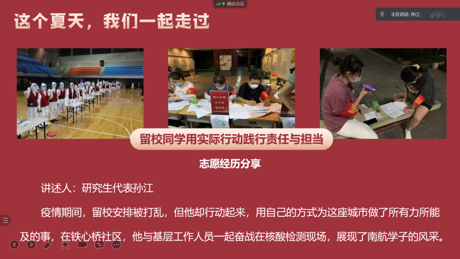 首先,施俞辛以暑假期间全国上下一盘棋应对暴雨、疫情等公共危机事件时所彰显出来的中国力量,以及奥运赛场上运动健儿们为国争光时所表现出的斗志与雄心,激发了学生面对未来的信心和勇气,同时,通过讲述南航学子在学校、在家乡投身防疫和抗洪的志愿故事,邀请学院暑期投身社区一线进行志愿服务的留宁学生代表孙江进行经历分享,进一步提升了学生将小我融入大我、争做有为青年的理想信念。