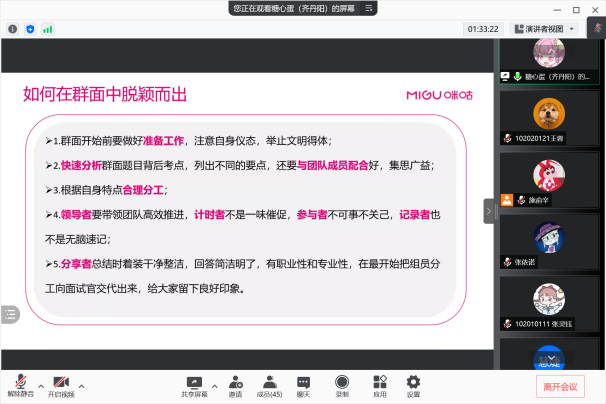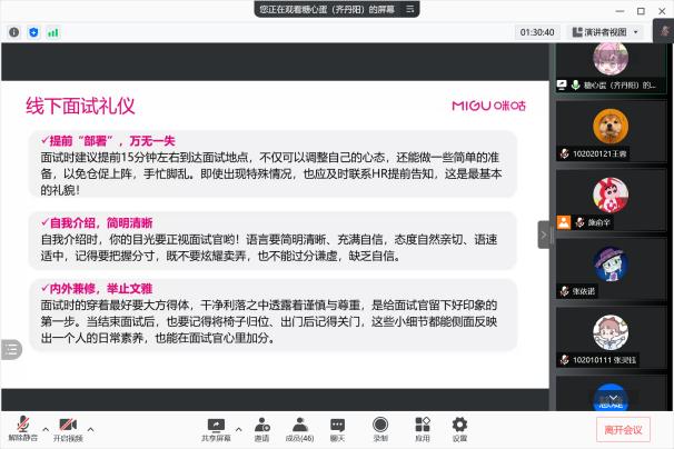 随后,齐丹阳以面试技巧为主题,结合线上、线下两种形式,向大家详细介绍了面试礼仪和具体细节。此外,她围绕单面和群面等不同场合,为学生讲解了能够使自己脱颖而出的方法。最后,齐丹阳简单介绍了咪咕近年来的发展数据和人才发展体系,作为HR,她十分欢迎本院同学前往单位应聘、实习,感受良好的av中文-av中文官方最新无码全集页。