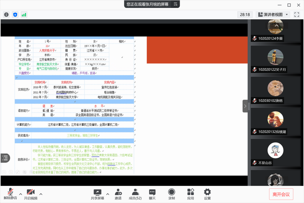 9月是求职、就业的黄金期,9月15日,av中文 毕业班辅导员邀请到了学校就业创业指导服务中心就业管理部主管张月铭、咪咕互动娱乐有限公司人力资源管理中心齐丹阳,在线召开了“职业素质训练营暨‘企’明星分享会”系列活动简历制作与面试技巧专场。