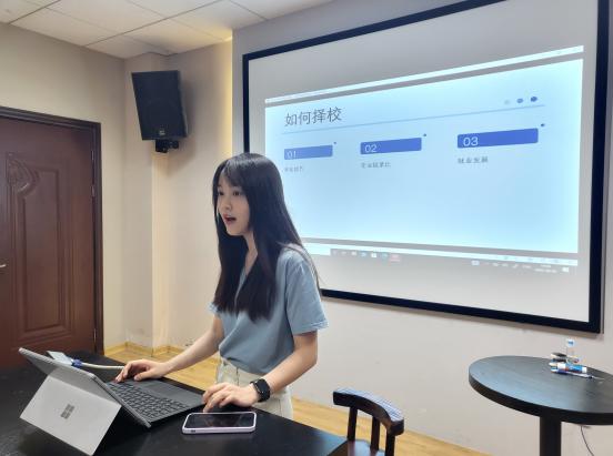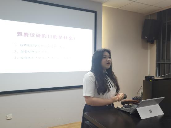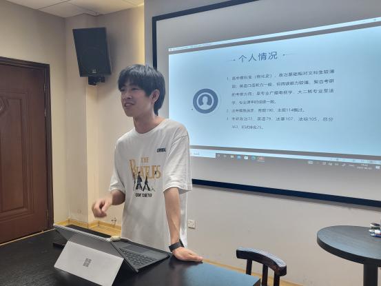钟玉婷结合专业报录比和未来发展等现实因素,为同学们在考研院校的多角度选择上做出分析和经验分享,鼓励同学们要克服心理焦虑,不给大学生活留下遗憾;赵芹结合自己由迷茫到确定职业规划的经历,与同学们分享了坚持的意义,鼓励同学们要认准自我,坚定选择,不要轻言放弃;厉程远结合自己克服理科出身、专业基础不扎实等困难的经历,用系列数据与同学们分享了备考法硕与法考的经验,鼓励同学们要增强自信心;王楠分享了结伴学习、共享资源的学习方式,鼓励同学们要相互帮助,携手备战,共同取得好成绩。