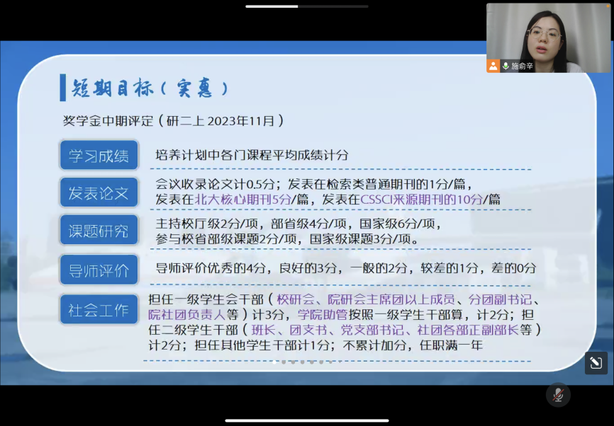 施俞辛首先详细介绍了研究生两年半的学业安排、信息自主获取途径、学业研究水平提升途径,并将研究生学习过程划分为短期目标和长期目标,为大家深刻剖析了提升自我的途径,为研究生新生的学习道路指明了方向。她从宿舍安全、疫情防控管理及规章制度等三个方面对同学们提出了要求,并特别强调了疫情期间,学生落实各项行为准则的必要性。