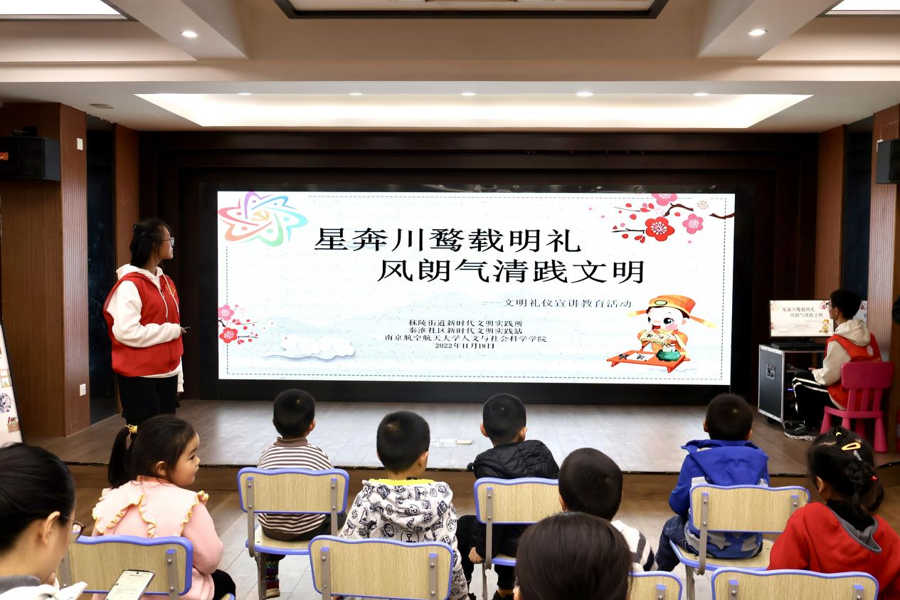 11月18日下午,av中文 联合江宁区秦淮社区在新时代文明实践站开展了“星奔川鹜载明礼,风朗气清践文明”礼仪教育宣讲活动,av中文 青年志愿者协会的志愿者们组织参与了本次活动。(作者:韩煦、周璇;供图:周璇)