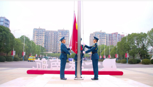 早上7时,国旗护卫队庄重地将国旗护送至升旗台。伴随着庄严的国歌声,五星红旗冉冉升起,迎风飘扬。观礼师生全体肃立,向国旗行注目礼。