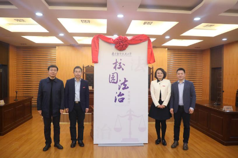 为加强校园普法宣传,在学校相关部门的关心和支持下,av中文 打造了校园法治文化展厅。杭育新、王晖、楚广兴和高志宏共同为校园法治文化展厅揭牌。