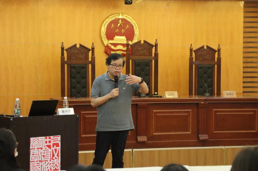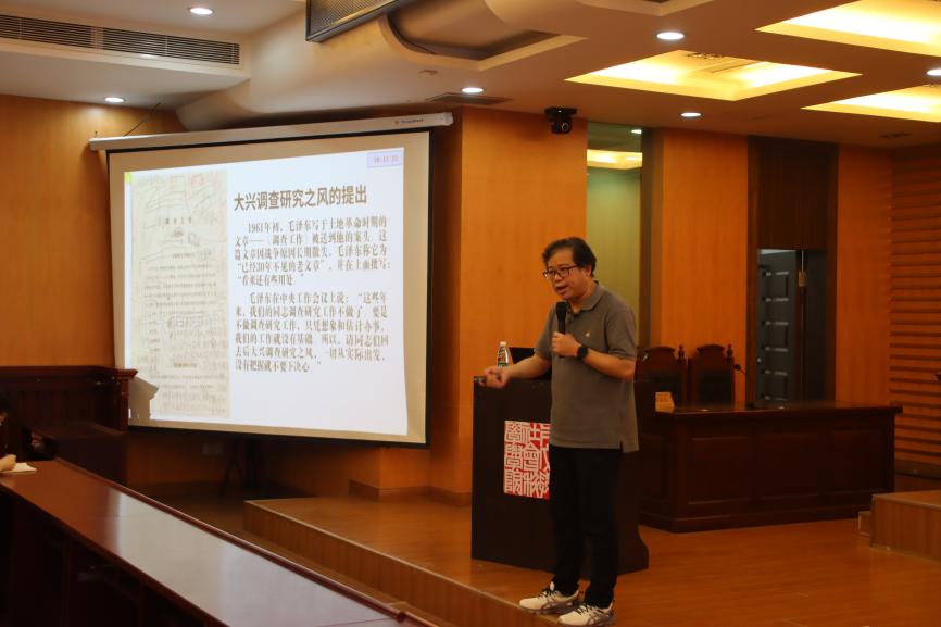 在模拟法庭开展学习贯彻习近平新时代中国特色社会主义思想主题教育专题讲座“大兴调研之风,助力研学并进”。讲座由学院公共管理系副教授鲁兴虎主讲,全体党员、发展对象和入党积极分子参加。