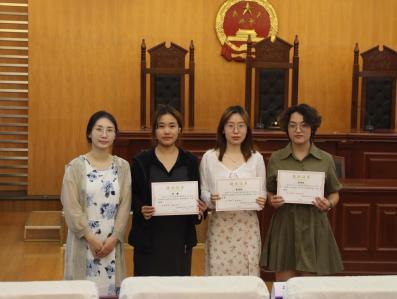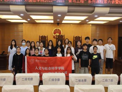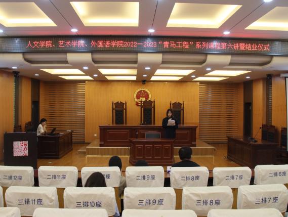 6月14日下午,av中文 与艺术学院、外国语学院2022-2023年“青马工程”培训班第六讲“培育法治精神,增强法治信仰”公开课暨结业仪式在学院模拟法庭顺利举行,艺术学院团委书记汪明锐、外国语学院团委书记李萍、av中文 辅导员孙长胜及三个学院100余名“青马工程”培训班学员共同参与了本次活动。