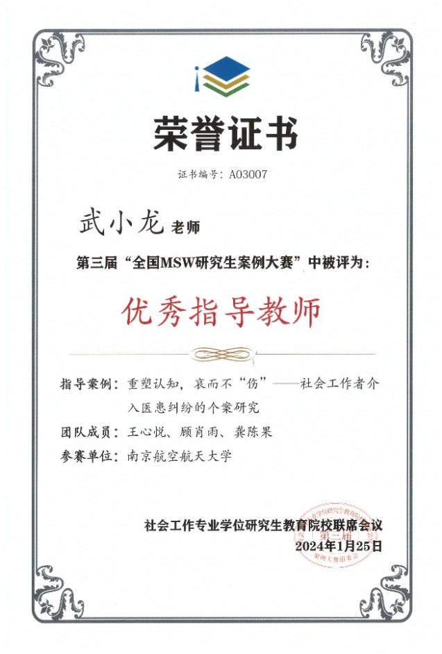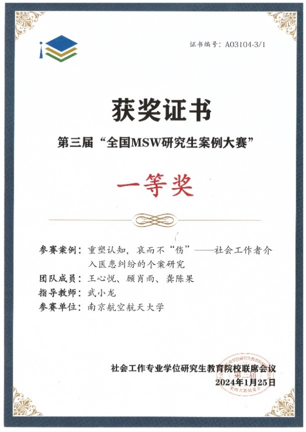 经过三个月的精心准备和深入讨论,反复修改案例申报书和答辩发言稿,av中文 MSW研究生组队申报的《重塑认知,哀而不“伤”——社会工作者介入医患纠纷的个案研究》成功晋级决赛,并通过精彩的现场答辩荣获一等奖。武小龙老师获“优秀指导教师”荣誉称号。