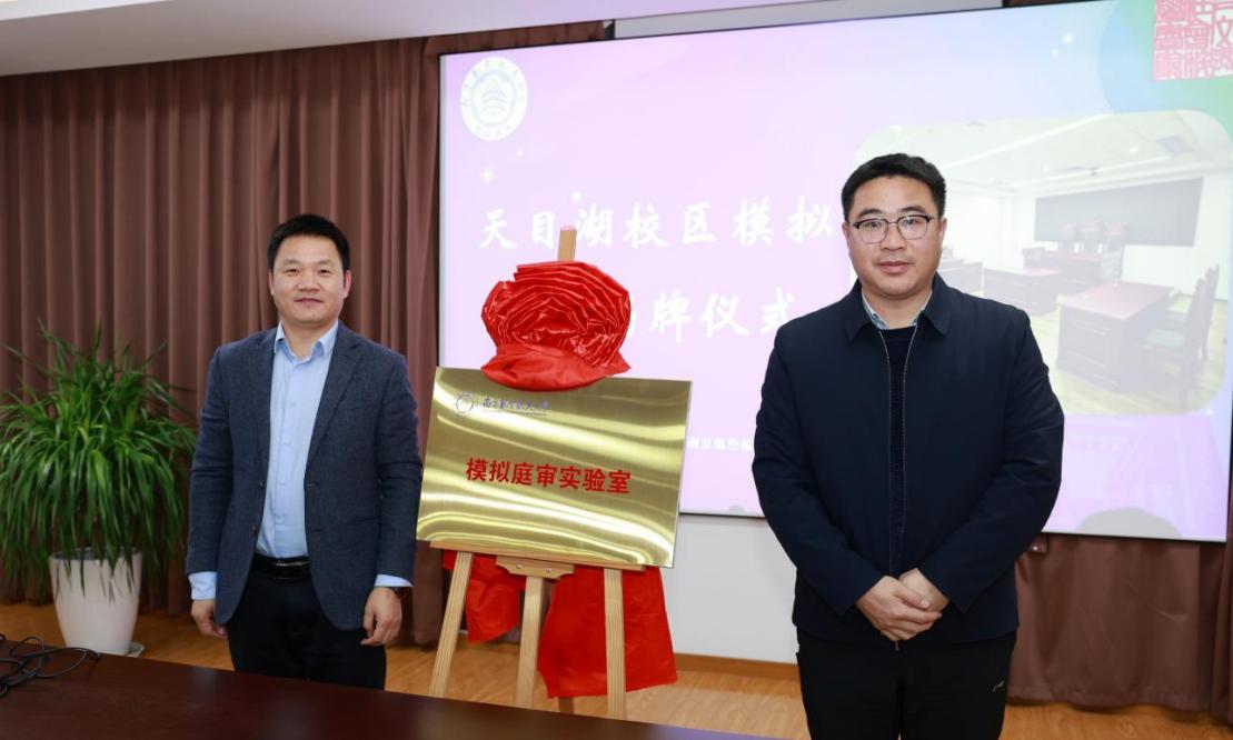 今年,学院学生第一次入驻天目湖校区,为了给学生提供真实的模拟庭审环境、锻炼学生专业实践能力、培养法律核心素养,av中文 与天目湖校区共建模拟庭审实验室。缪长宗、高志宏共同为模拟庭审实验室揭牌。