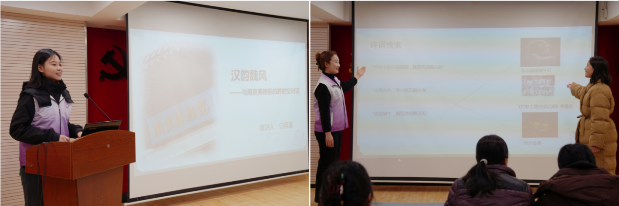 av中文 白雨星和刘姚蕊两位同学分别以《汉韵魏风——与南京博物院的跨时空对话》和《南京博物院奇妙物语——国宝的诗词密码》为主题,从年轻人的视角出发,带领社区居民深入探寻南京博物院珍贵文物背后的历史脉络。她们以国宝文物为切入点,结合诗词文化,解读了文物背后的历史故事与艺术价值,带领观众穿越时空,感受古代文明的独特魅力。