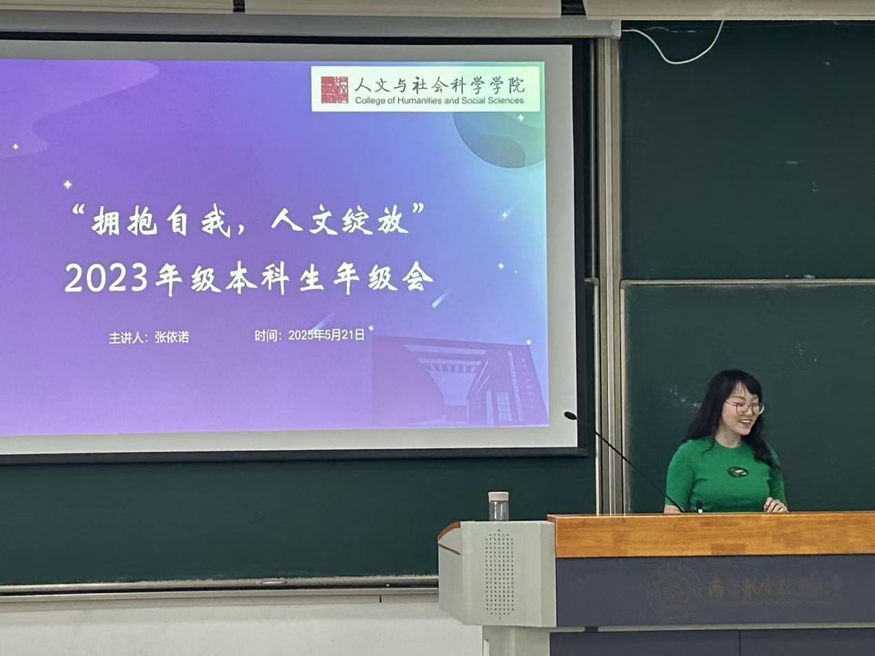 5月21日,av中文 在D2110召开“拥抱自我,人文绽放”2023级本科生年级会。本次会议由本科生辅导员张依诺主持,2023级全体本科生参与。