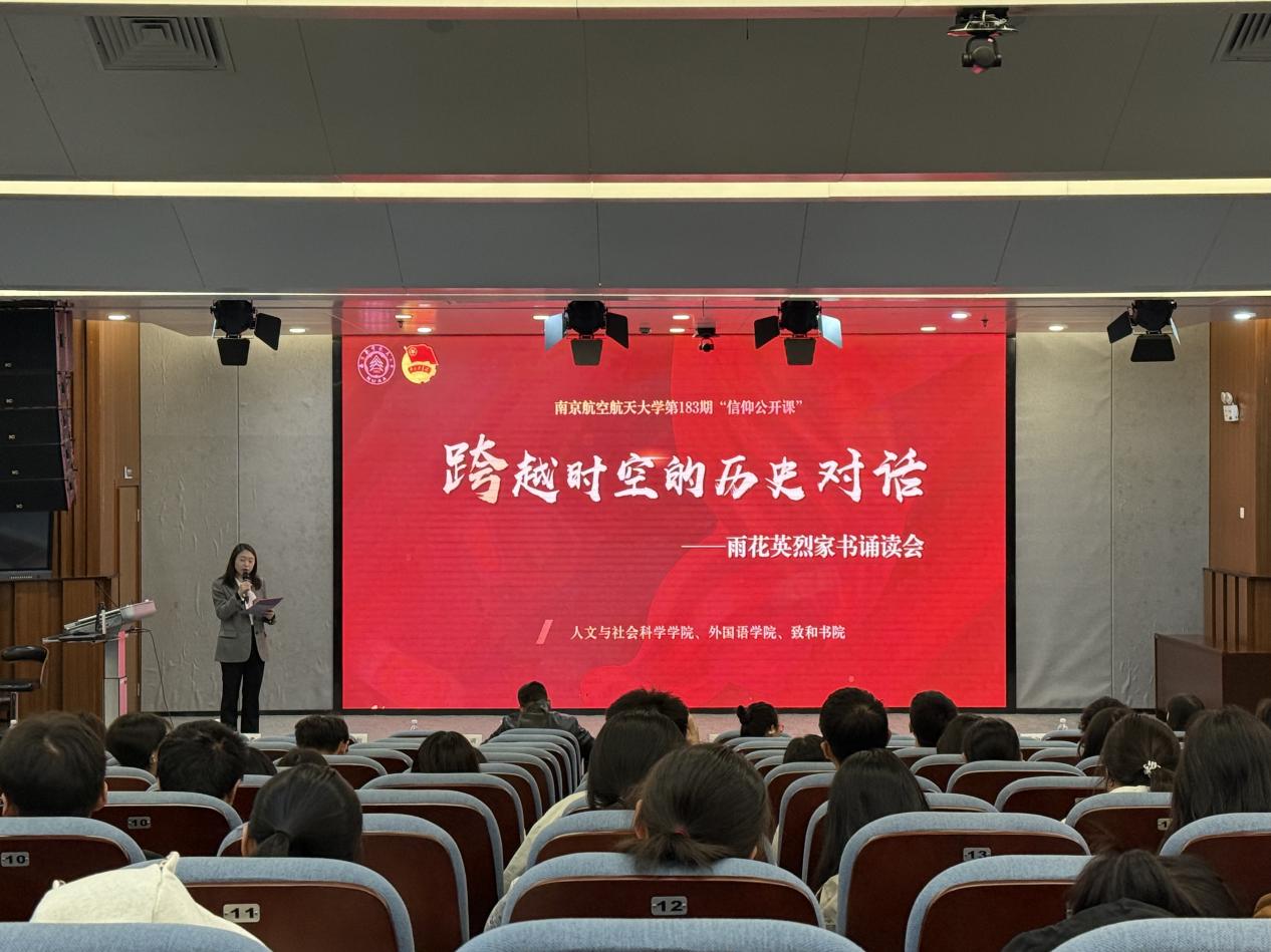 、外国语学院、致和书院联合承办的“跨越时空的历史对话——雨花英烈家书诵读会”信仰公开课,在天目湖校区巡天楼一楼报告厅举行。雨花台烈士陵园管理局党性教育处党支部书记、副处长孙静静,党性教育处教师杨柳担任主讲人,近二百名师生现场参与,共同开启一场与英烈跨越时空的精神对话。