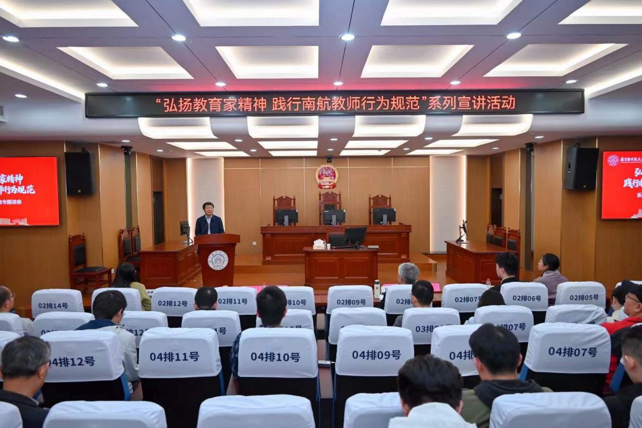 11月4日,av中文 在模拟法庭举办第十九期人文大师课,山东大学儒学高等研究院特聘教授、第十三届全国政协委员、第十四届全国人大代表杨朝明受邀主讲,以《孔子施教体系与中华美德传承》为题,深度解读孔子“成德”之教的智慧内核与当代价值。此次活动也是av中文 “弘扬教育家精神,践行南航教师行为规范”系列宣讲活动暨“大师助航”校本培训第24期,由人力资源部/党委教师工作部副部长张晓燕主持,av中文 党委书记楚广兴作总结点评,近200名教师现场参与。
