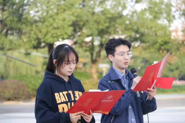 7时整,升旗仪式在雄壮的国歌声中拉开帷幕,全体师生肃立行注目礼,齐唱国歌。2022级本科生沈泓宇作为学生代表发言,他号召同学们将爱国情、强国志、报国行自觉融入新时代奋斗征程;2023级本科生叶丽娜、洪鹏程深情演绎抗战经典篇目《不朽》,带领师生重温峥嵘岁月,感悟精神力量;学院退休教师、兼职辅导员于龙才老师结合四十余载从教经历,深情寄语同学们珍惜学习时光,专注课堂,积蓄能量,为实现中华民族伟大复兴的中国梦贡献人文担当。