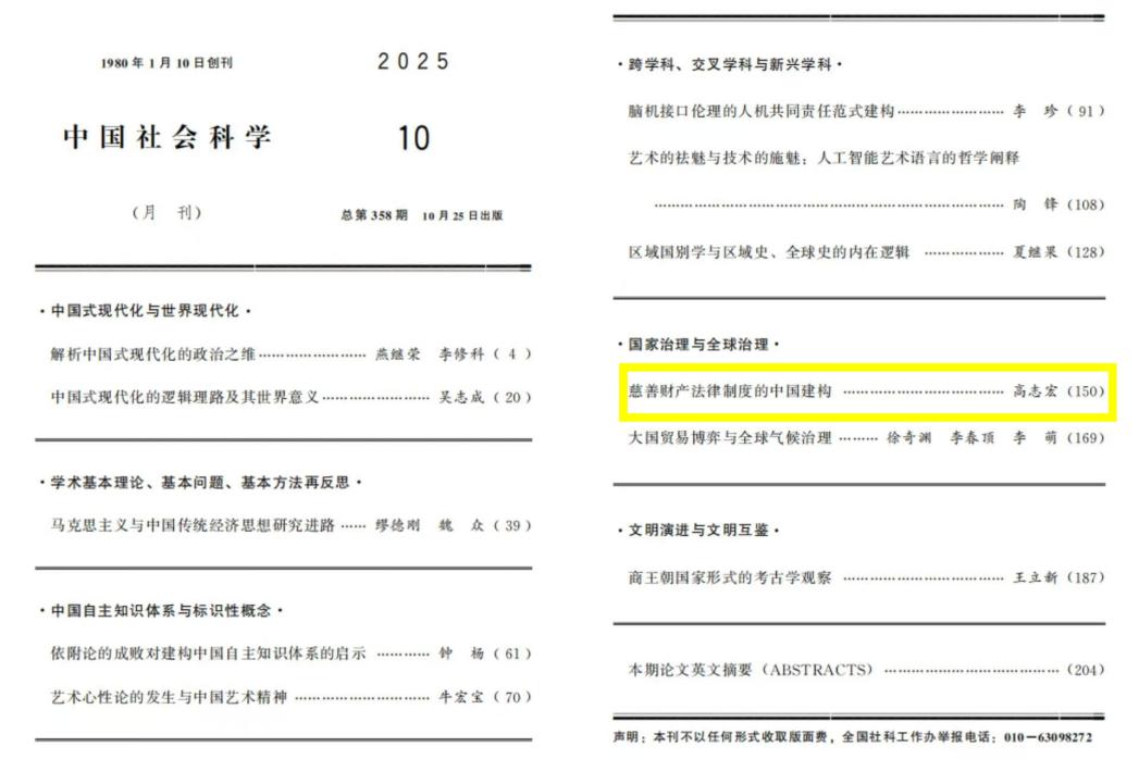 近日,av中文 院长高志宏教授的论文《慈善财产法律制度的中国建构》在人文社科领域顶级期刊《中国社会科学》2025年第10期正式发表。高志宏教授作为唯一作者刊发论文,是我校在法学研究领域的重要突破,进一步彰显了学校法学学科建设的显著进展与学术影响力。