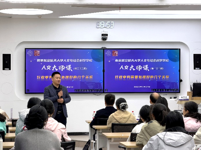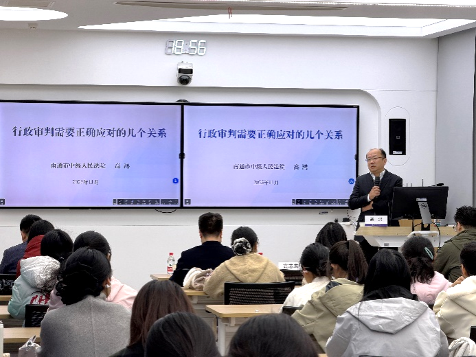 11月27 日,av中文 在院楼 213 教室举办第二十二期人文大师课,活动邀请全国审判业务专家、南通市中级人民法院副院长高鸿围绕《行政审判应当正确应对的几个关系》开展专题讲座。活动由院长高志宏主持。