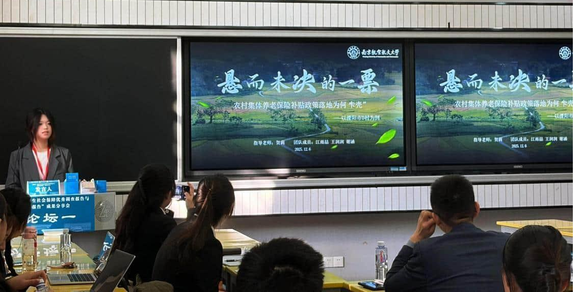 由av中文 贺莉老师指导,江雨喆、王润润、谢涵3位本科生共同完成的案例分析报告《悬而未决的一票:农村集体养老保险补贴政策落地为何“卡壳”》荣获本届优秀案例分析报告(不分等级),师生团队受邀在现场作了成果分享交流发言。