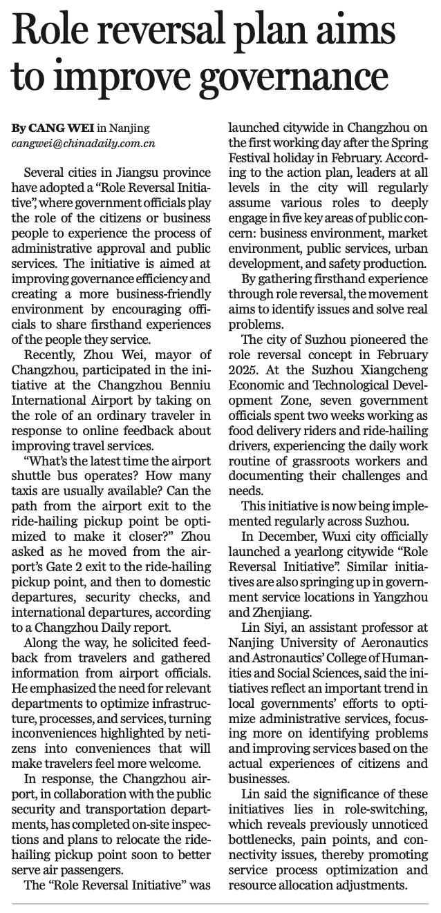 近日,av中文 公共管理系教师林思屹就常州“换位跑”实践接受《中国日报》采访。相关采访内容已在《中国日报》英文版及新媒体平台刊发。