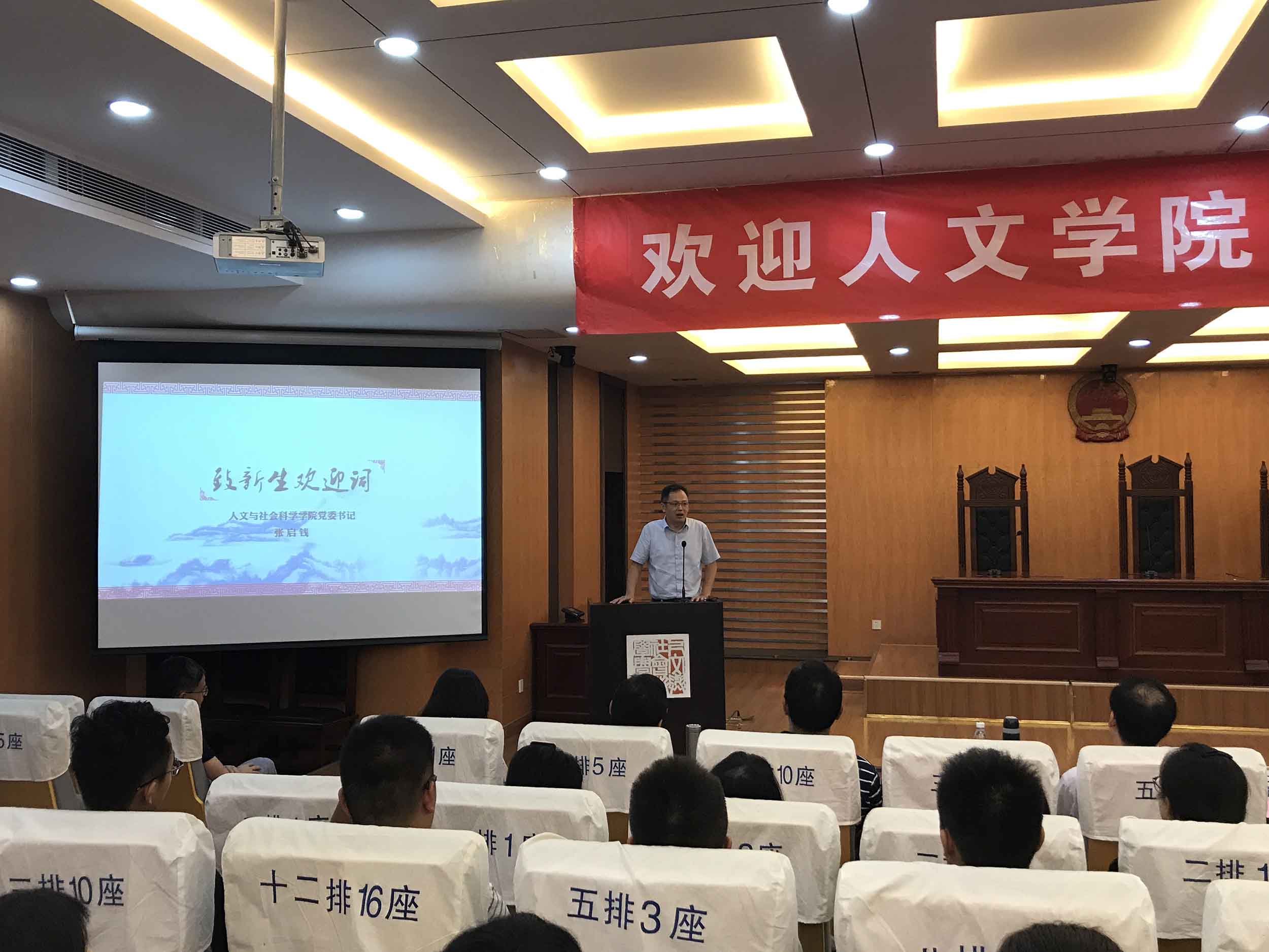 见面会在专业介绍视频中拉开帷幕,施向峰副院长首先向在座新生们介绍了与会领导和各位老师,帮助新生们进一步了解学院的基本情况和师资力量。院党委书记张启钱老师代表学院向新生致欢迎辞,迎接各位新生加入人文院的大家庭。在致辞中,张书记提出同学们需要尽快完成高中生到大学生的角色转换,思考大学和未来的人生规划,同时激励新生们应当严格要求自己,做一名高素质公民。院长王建文教授则围绕“成为一个什么样的人,怎样成为这样的人”对“厚德弘毅,博学创新”的院训进行深入解读,鼓励同学们在大学期间制定各类目标,度过充实的大学生活。最后,2017级本科生侯苗仪作为新生代表发言,她向学院领导、老师和学长学姐们的支持和帮助表达感谢,畅谈了自己对于大学生活的美好憧憬与期待,并表示一定会在学业上努力奋发向上。
