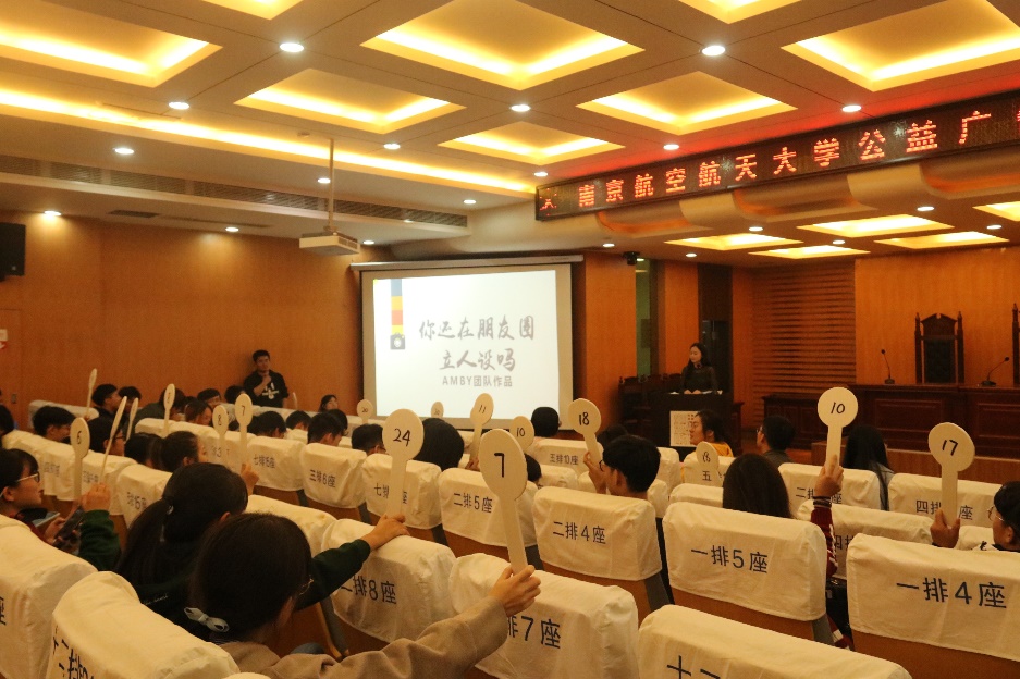在南航六十六周年校庆之际,10月19号晚七点, “公益为媒 · 广而告之”av中文 首届公益广告设计大赛在av中文 模拟法庭成功举办。av中文 代理团委书记、辅导员彭汉帝,本科生辅导员聂小芳、研究生分团委副书记王梦珂、研究生尚靖凯,校科协主席谢文雅出席比赛,与三十位大众评委共同参与最终大奖的归属的抉择,来自各个学院的同学在台下观看了全场比赛。