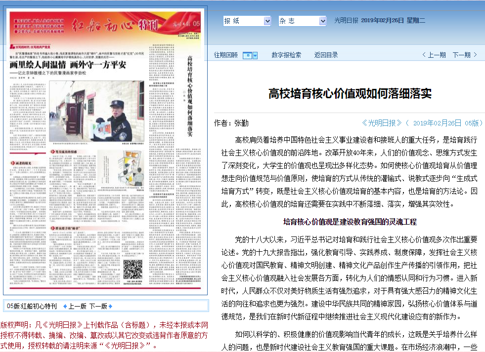 2019年2月26日,《光明日报》红船初心特刊发表av中文 张勤教授的理论文章《高校培育核心价值观如何落细落实》。