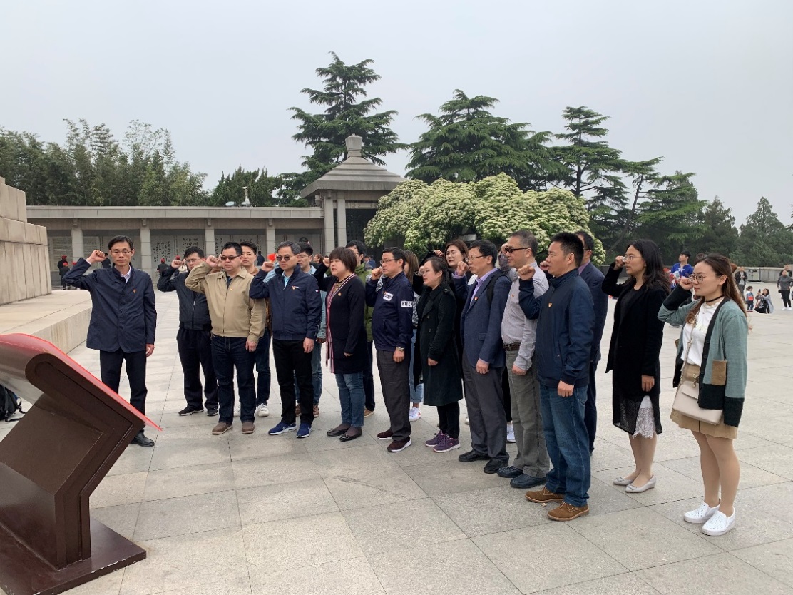 在淮海战役烈士纪念塔前,全体党员教师在学院党委书记刘虎的带领下,面对党旗庄严宣誓,重温入党誓词的庄严承诺和坚定决心。