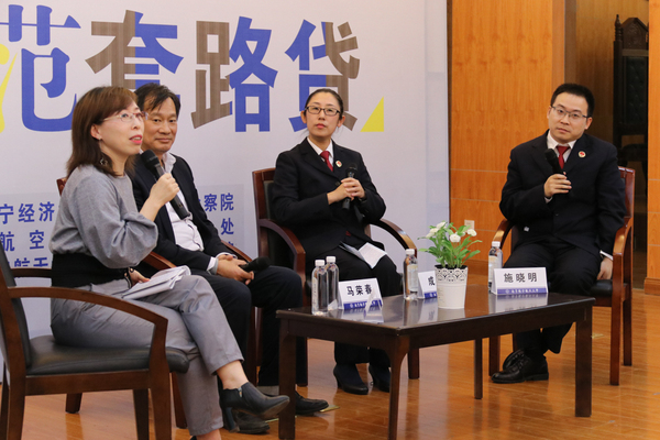 在“主题沙龙”环节中,南京市人民检察院检察官施晓明、南京江宁经济技术开发区人民检察院检察官成华、av中文 法律系马荣春教授为现场同学答疑解惑。同学们踊跃提出了自己关于“校园贷”和“套路贷”的问题。根据以往的办案经验,两位检察官认为,大学生与父母之间普遍缺少有关金钱、消费方面的交流,大学生对家庭收入情况了解不足,与父母的消费观念存在差距,这些都是导致大学生盲目相信并选择校园贷的重要原因。谈到“是否该杜绝校园贷”的问题,av中文 法律系教授马荣春认为,完全杜绝校园贷并不符合大学生的发展需求,也不符合经济发展的需要。但不少套路贷会披着“民间借贷”的外衣,大学生应主动学习相关的法律知识,提高鉴别“不良校园贷”能力,维护自身合法权益。