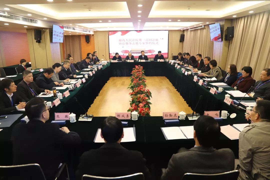 12月11日上午,最高人民法院第三巡回法庭举行诉讼服务志愿专家签约仪式,av中文 熊敬老师应邀参加。签约仪式由最高人民法院第三巡回法庭分党组成员、专职党务干部(廉政监察员)马永欣主持,最高人民法院第三巡回法庭分党组副书记、副庭长李成玉、最高人民法院第三巡回法庭诉讼服务中心主任彭艳、副主任杨心忠、副主任李勇、中国法学会会员部主任张所菲、中国法律咨询中心副主任任伊珊、中国法律咨询中心项目管理部副主任李中顼、江苏省法学会党组副书记、专职副会长范沁芳、江苏省法学会研究处二级调研员顾虎明、江苏省法学会秘书处一级主任科员高春霞以及江苏省高校专家学者和律师事务所资深律师参加了签约仪式。