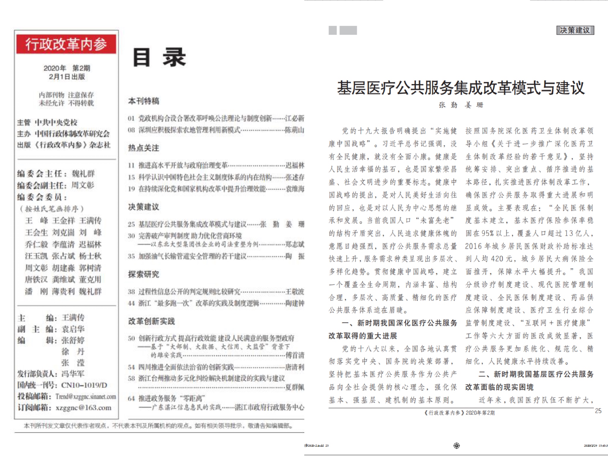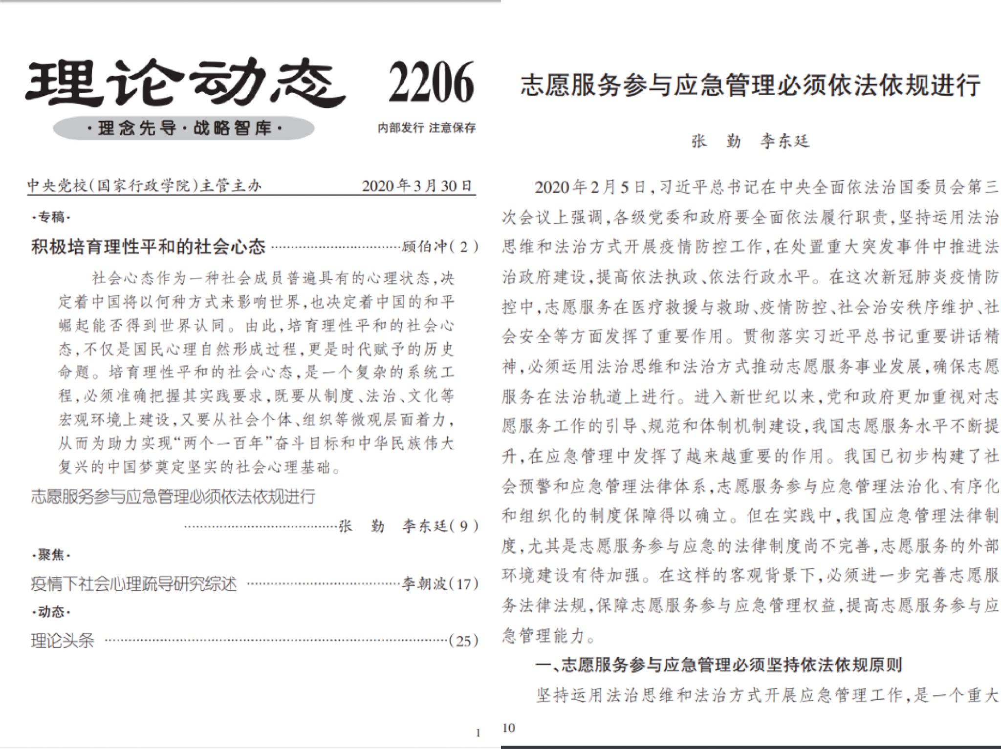 我院师生在全力落实上级部门及学校抗疫部署的同时,积极利用“宅”家时间,以问题为导向,加强学术研究与探讨,坚持居家研学不懈怠,利用专业优势积极为抗疫献言献策,并喜获成效。在2月1日与3月30日的《行政改革内参》与《理论动态》上,分别刊发了av中文 张勤教授与学生共同研究撰写的两篇文章《基层医疗公共服务集成改革模式与建议》、《志愿服务参与应急管理必须依法依规进行》。