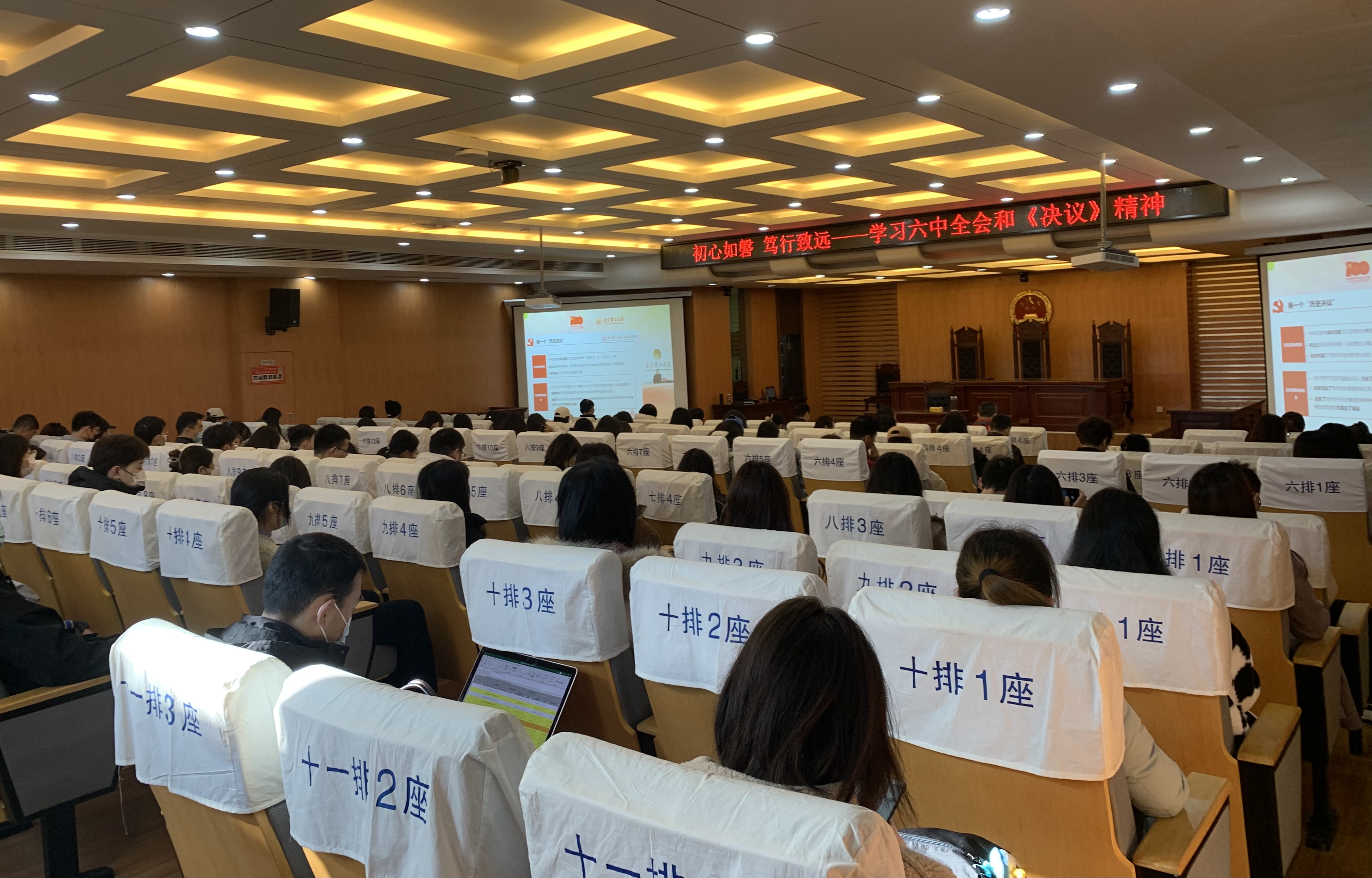 11月24日,av中文 组织全体中层党员领导干部及师生党员、发展对象、积极分子,“青马工程”培训班学员在学院模拟法庭参加了工信部党史学习教育第七巡回指导组专题党课。