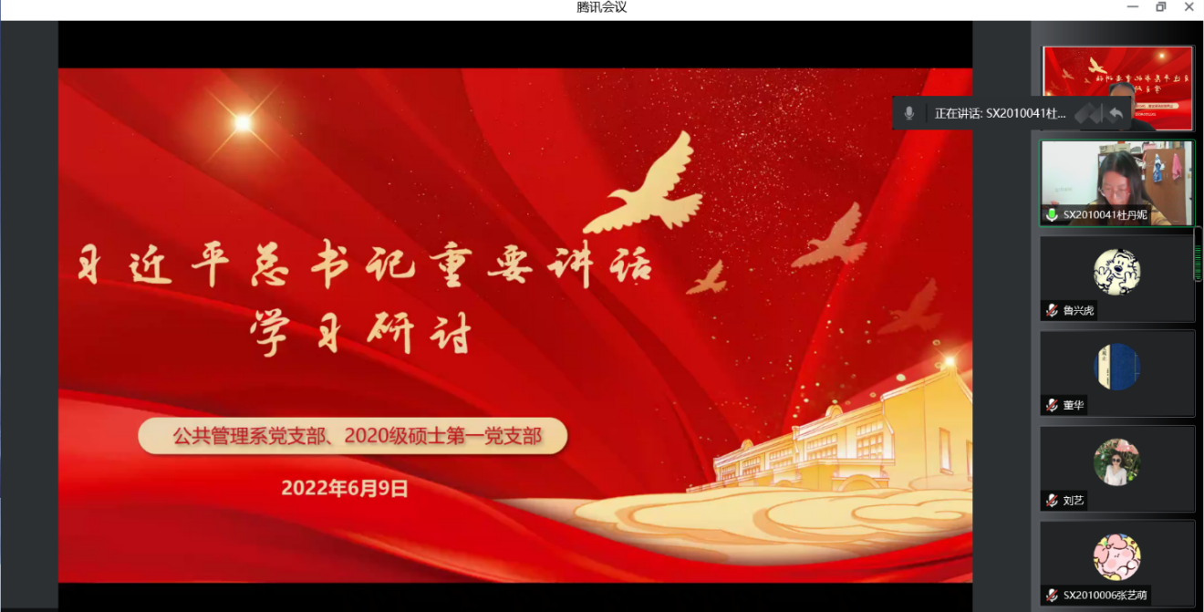 6月9日晚,av中文 公共管理系教工党支部与学生2020级硕士第一党支部开展联合学习,专题学习了习近平总书记近期重要讲话精神。公共管理系党支部全体党员,2020级硕士第一党支部全体党员、发展对象、积极分子参加了会议。会议由公共管理系党支部书记许汉泽主持。