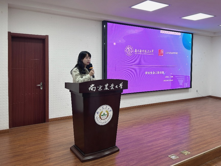 活动在南京农业大学研究生报告厅举行。av中文 研究生会主席团成员冯妍首先进行了工作汇报,她从“务实拓新、打造人文品牌”“思想引领、凝聚青年力量”“多元精进、驱动交叉学习”“活力人文、抒写青春洋溢”“维权实践、关爱拾愿身心”“价值宣扬、传播多彩之音”六个方面对研会日常工作和特色活动做了分享。随后,其他学院研会代表也结合各自的工作经验与特色做了汇报分享。