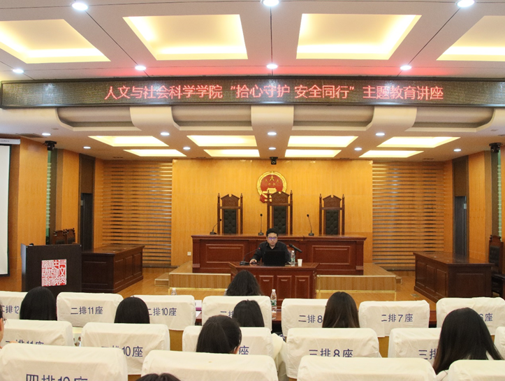 5月11日晚,av中文 在模拟法庭开展 “拾心守护,安全同行”主题教育讲座,邀请保卫处治安管理科科长黄超峰、学院公共管理系教师王媛担任主讲嘉宾,各年级学生干部、寝室长参加了讲座。