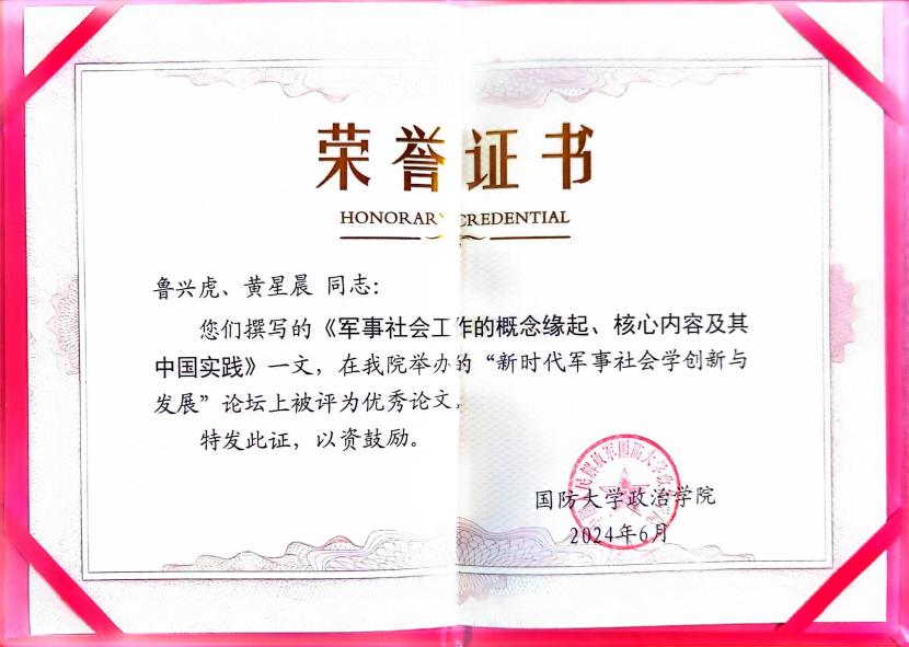 此次论坛中,av中文 社会工作硕士(MSW)教育中心主任鲁兴虎老师与硕士研究生黄星晨共同撰写的论文《军事社会工作的概念缘起、核心内容及其中国实践》荣获优秀论文奖。论文通过对军事领域各方面的深入研究,提出了促进军事社会工作发展的新思路。
