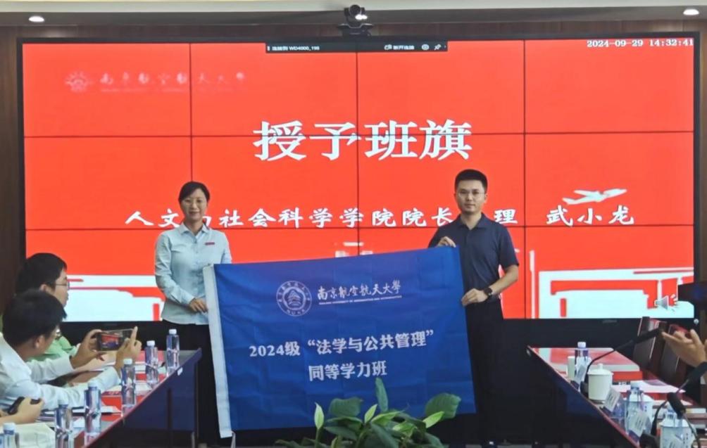 随后,院长助理武小龙老师为学员授予班旗,寄托了对学员们以班级为依托、以南航为平台,学习向未来的殷切期待。