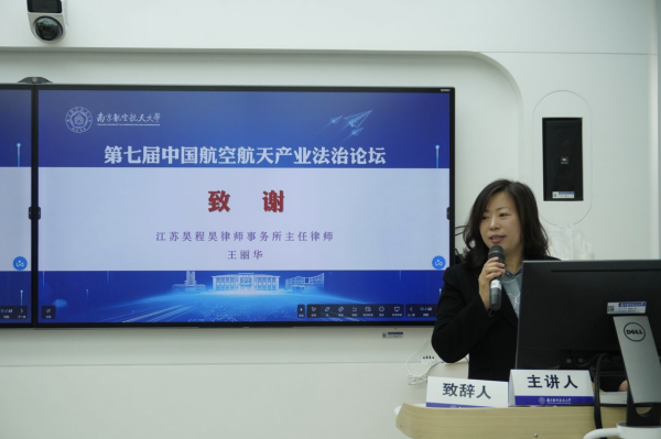 江苏昊程昊律师事务所王丽华主任在研讨会致谢环节向参会专家表达感谢,并表明未来会与av中文 携手,助力航空航天法治事业发展。