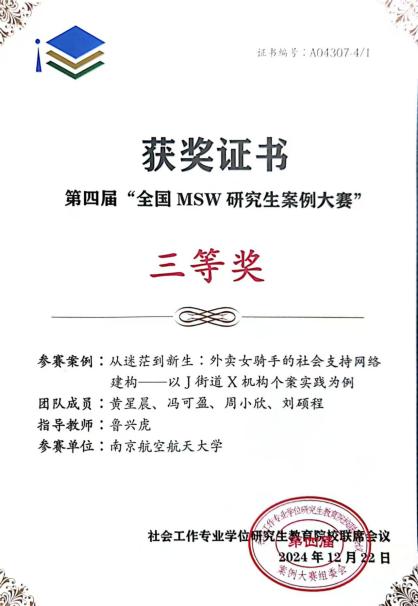 在总决赛中,av中文 团队凭借扎实的社会工作实践分析和创新的介入策略,最终斩获了大赛三等奖。该团队由23级社会工作专业黄星晨、冯可盈以及24级社会工作专业周小欣、刘硕程组成,在团队成员的共同努力下,团队不仅展示了对外卖女骑手群体需求的深入理解,还提出了可操作的社会支持网络建构方案,为外卖女骑手的社会支持提供了新思路。